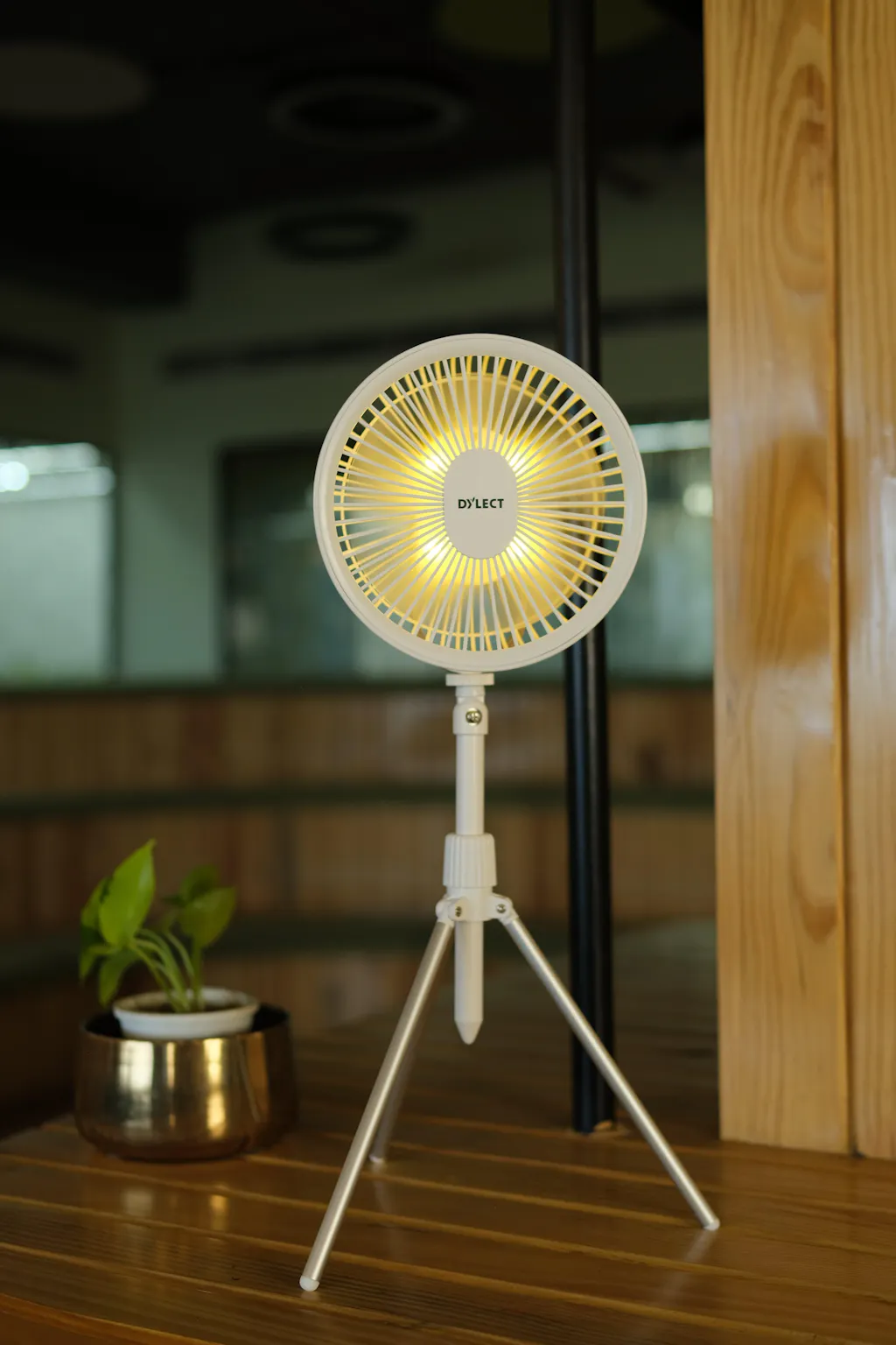 - LED Light with Adjustable Brightness & Tripod Stand: Equipped with a built-in night light, this charging fan with light is perfect for low-light areas, bedtime reading, or during power outages. The flexible tripod stand allows placement anywhere — on desks, counters, or bedside tables. It’s a smart cooling fan with light and flexibility.